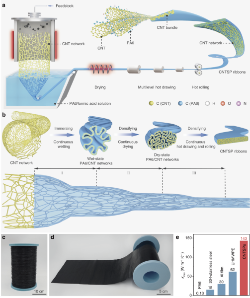 研究团队采用浮动催化剂化学气相沉积法制备出长碳纳米管网络,将其浸入聚酰胺6(PA6)/甲酸溶液中,实现了高达59wt%的碳纳米管负载。该过程既保留了碳纳米管原有的高长径比,又促使其与聚合物分子发生自发融合,有效提升了碳纳米管的取向度与堆积密度。这种特殊的微观结构赋予了碳纳米管超级塑料卓越的热学性能,且呈现出高度定向的传热特性。同时,该材料还兼具优异的力学与电学性能。
